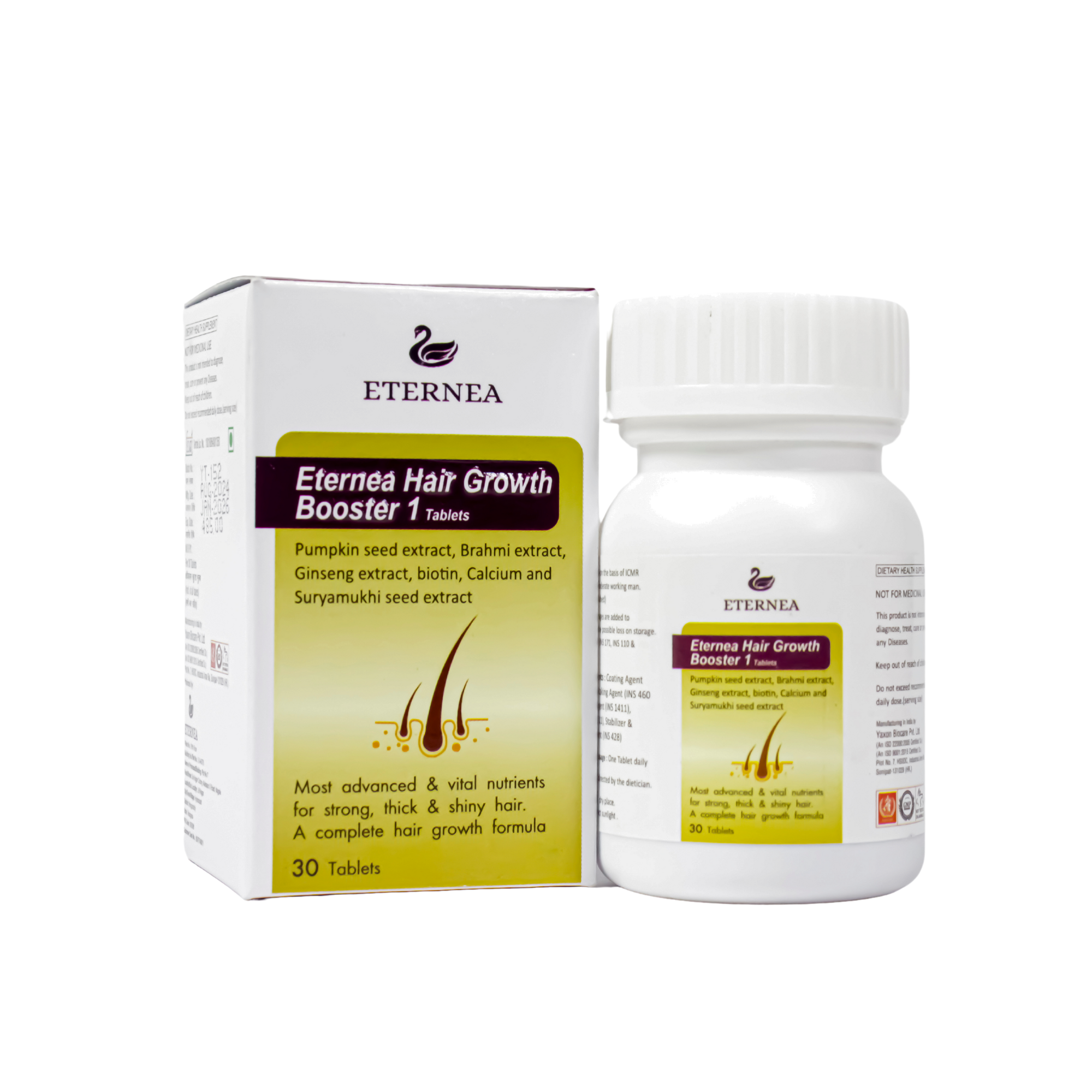 Eternea Hair Growth Booster 1 | 30 Tablets – Boosts Hair Growth Naturally with Pumpkin Seed Extract, Brahmi Extract, Ginseng Extract, Suryamukhi Seed Extract, Calcium and Essential Vitamins and Minerals | Combats all types of Hair Loss | For Men and Women